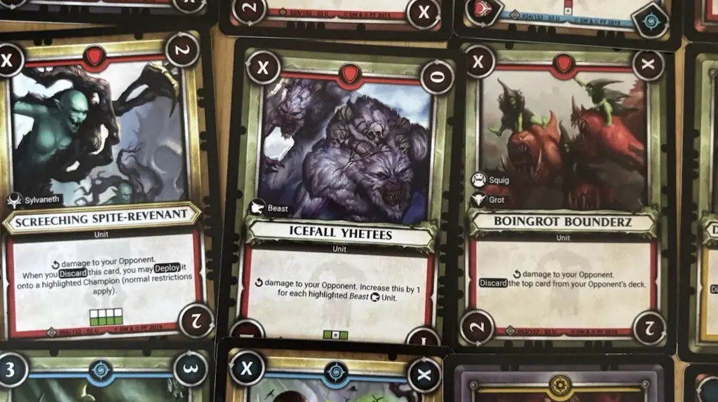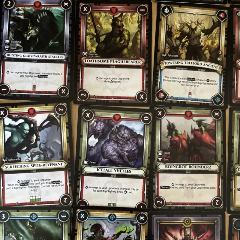 Warhammer miniatures, cards, and artworks on display